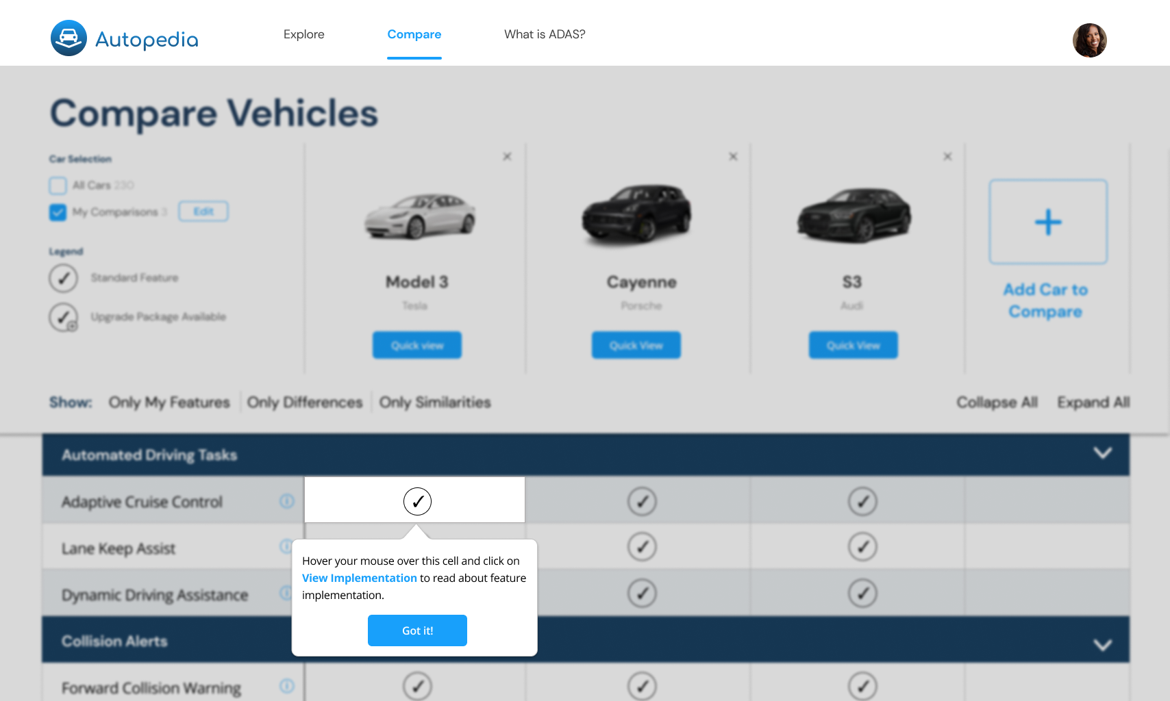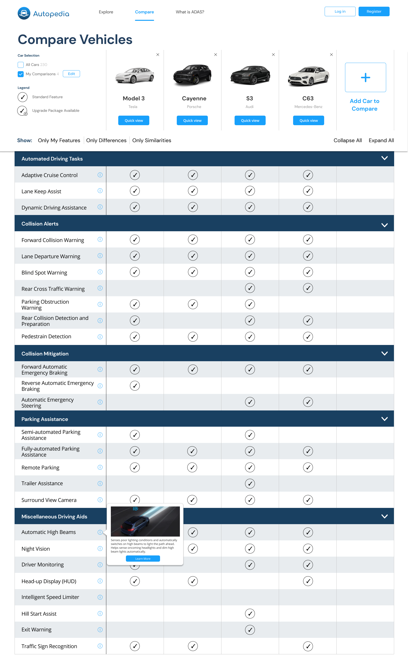 We conducted market research on successful comparison UIs to get a better sense of how to reduce the cognitive load for users needing to process and compare large amounts of information. By giving users the freedom to collapse and expand certain ADAS categories, as well as tooltips to remind users of feature definitions, we hoped to further limit the amount of information the user need to process at one time.