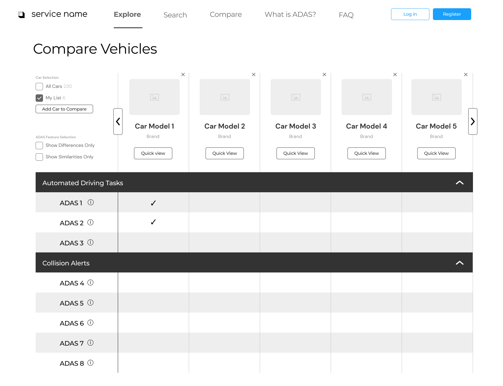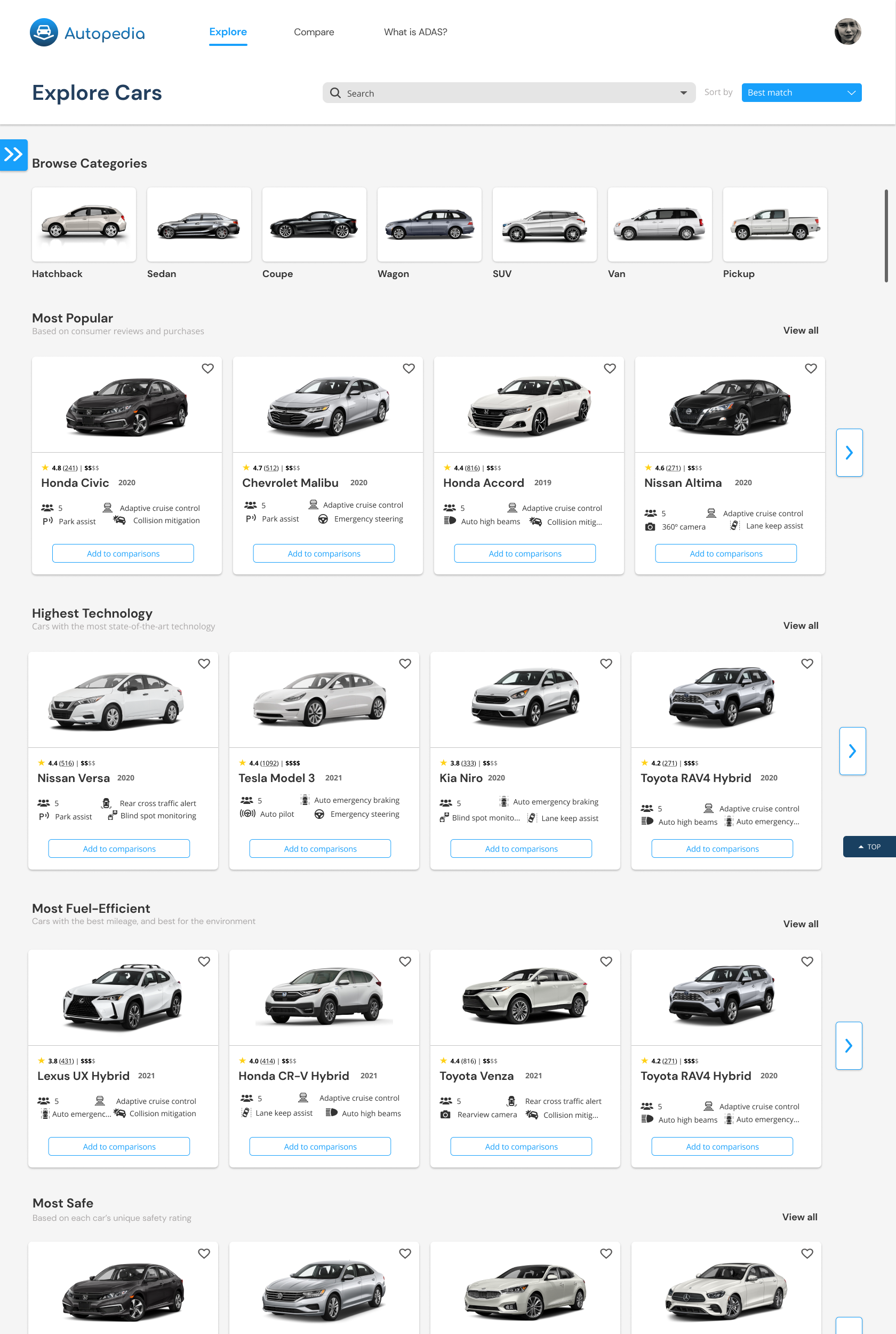 One of the most important aspects of our site was its ability to compare cars and the ADAS within them, so the user could make educated decisions about what car would be the best fit for them. In order to make this possible, we needed to present large amounts of information without overwhelming our user. Research suggests that people can’t compare more than five items at a time, so we decided to limit the comparison page to displaying five cars at a time.