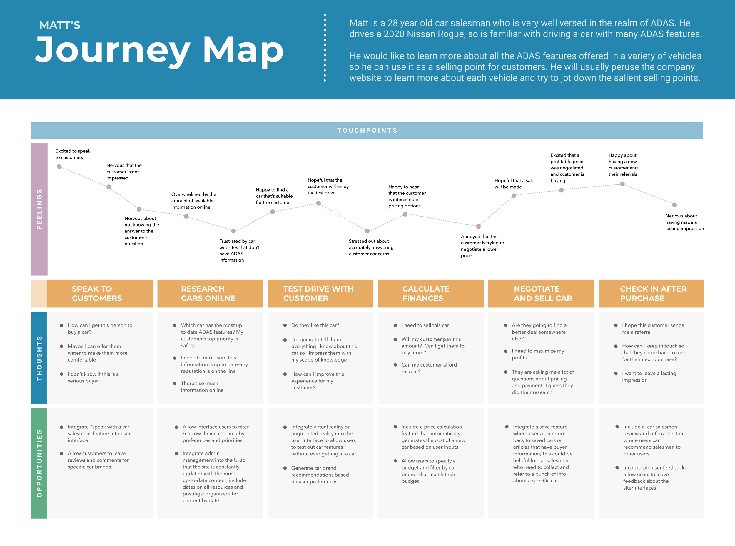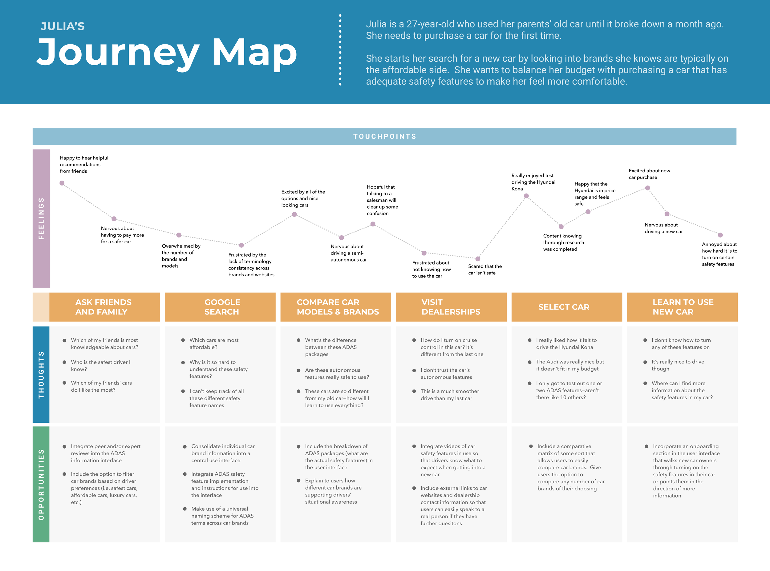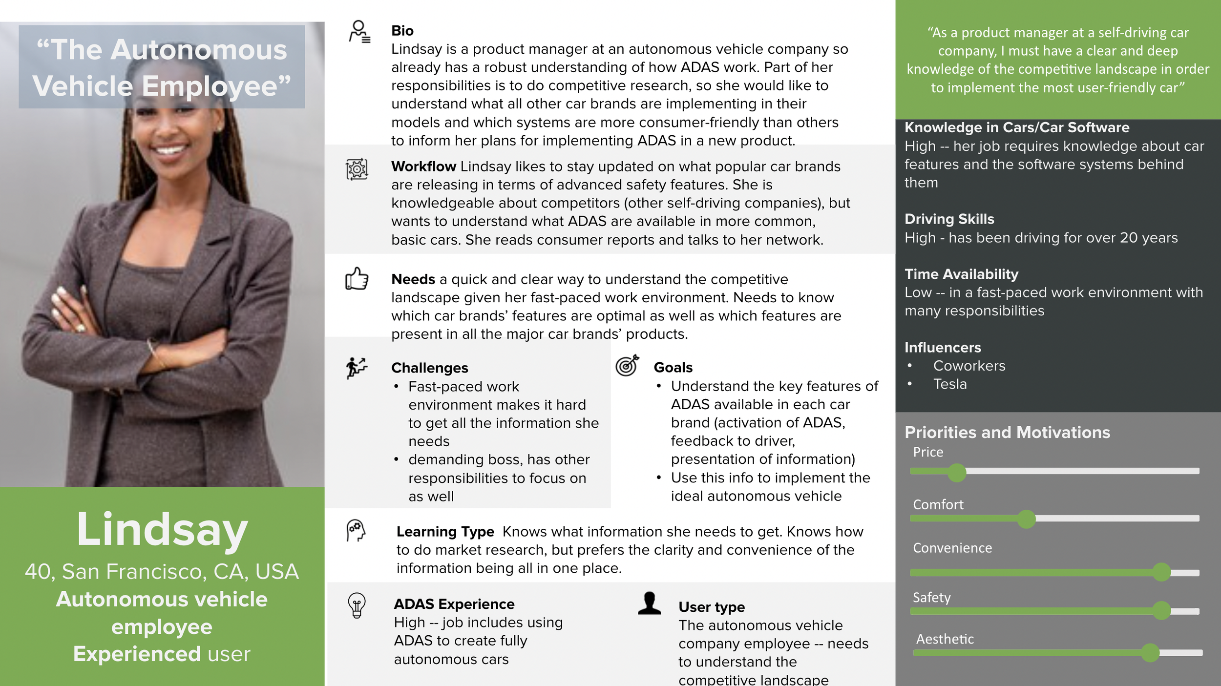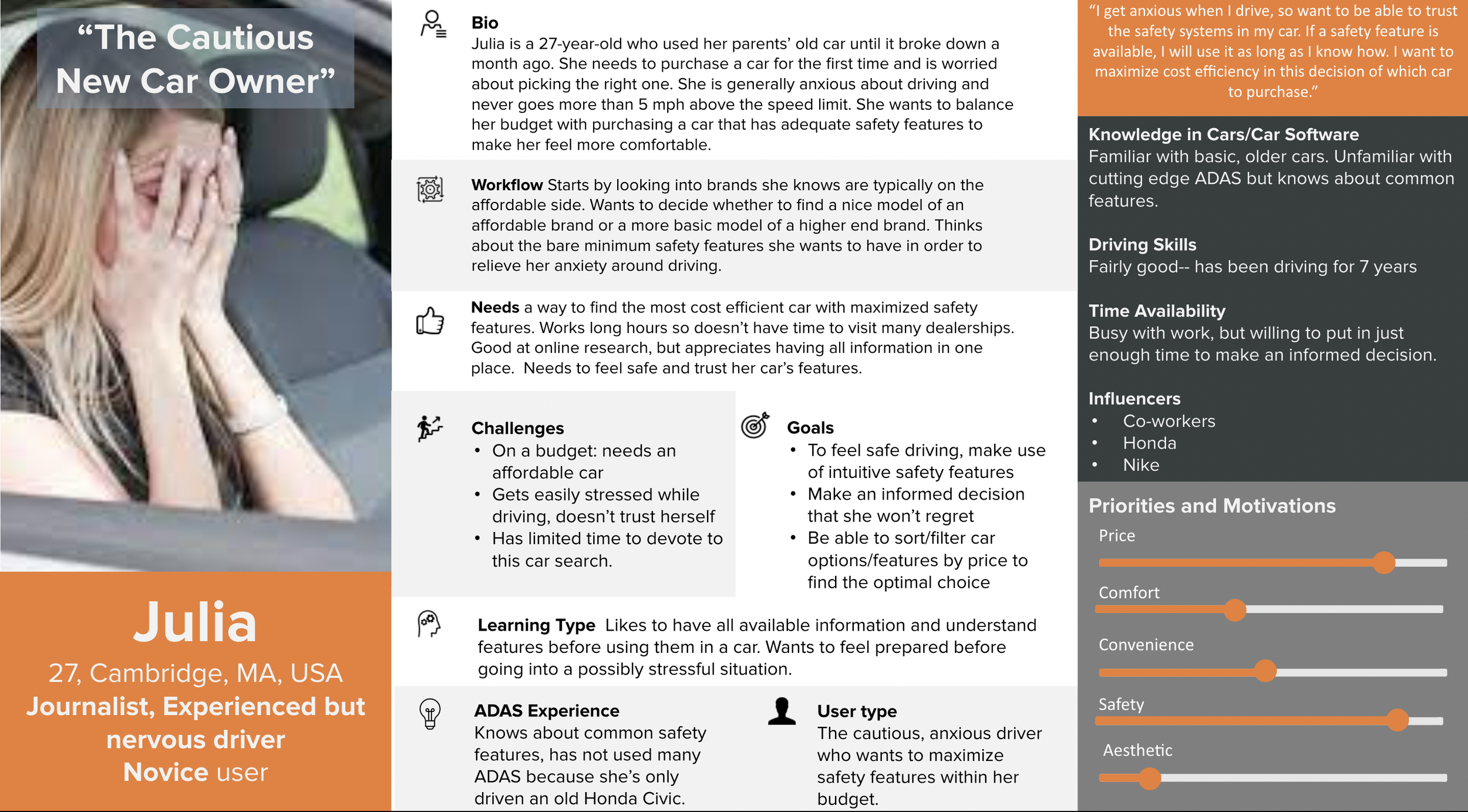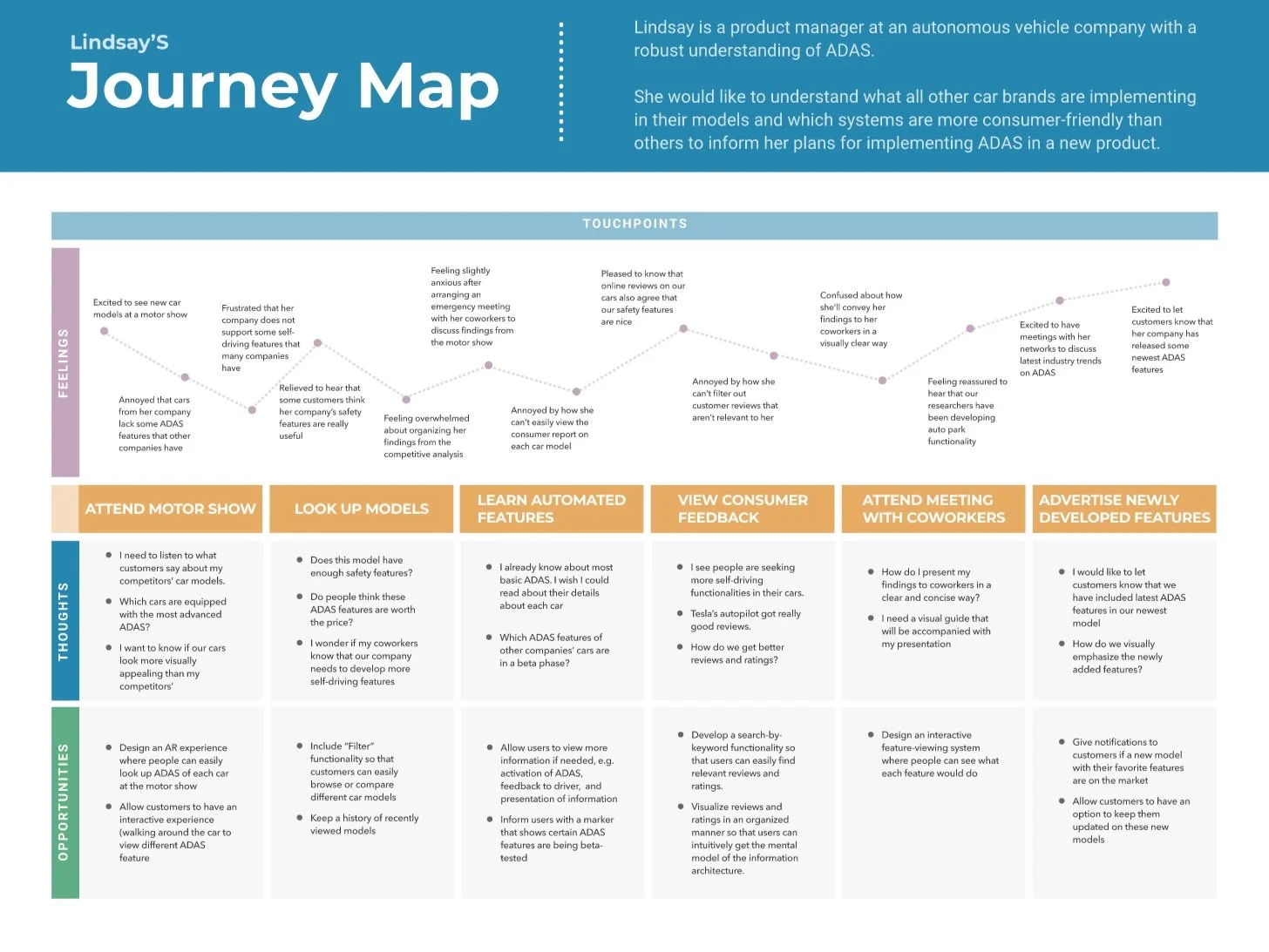 We opted to narrow our project scope to address the needs of our two primary users: Julia, the cautious new car owner, and Lindsay, the autonomous vehicle employee. With this in mind, we addressed the aspirations and workflows of these two personas.