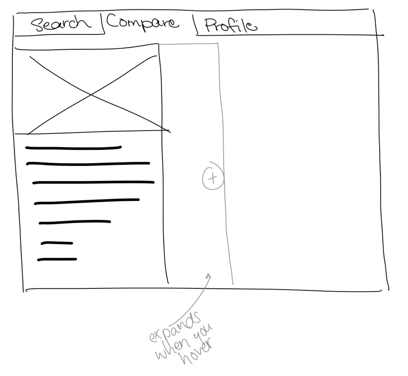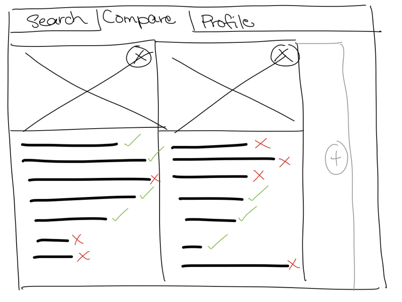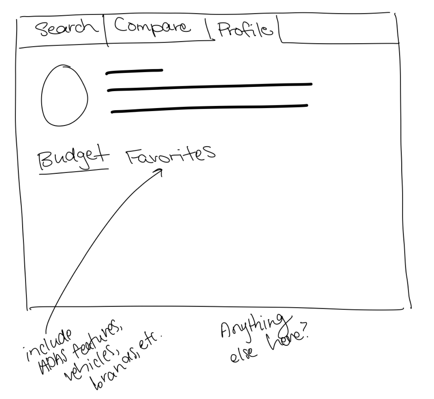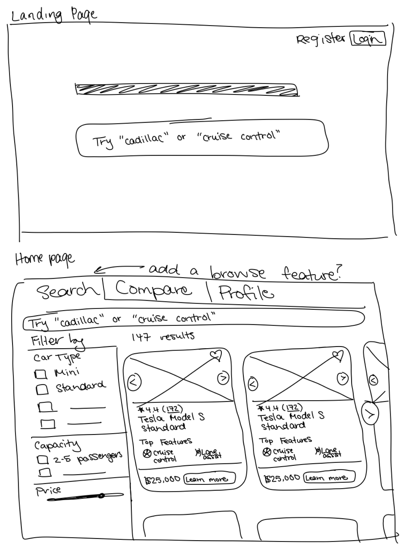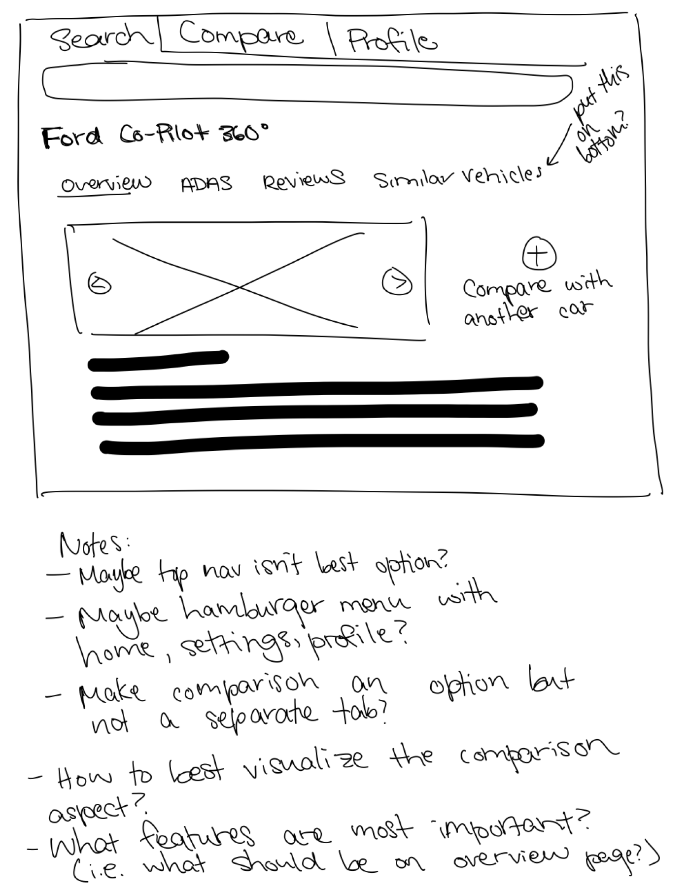 The primary goal for the sketch phase was to get all my ideas on paper—or iPad in this case—it wasn’t intended to be clean at all. In fact, at this point, I was looking for quantity over quality. I experimented with different layouts for the landing page, the dashboard, the car/ADAS comparison page, and the user profile. Sketching my thoughts on my iPad gave me an idea of how my ideas would look without having to commit to anything.