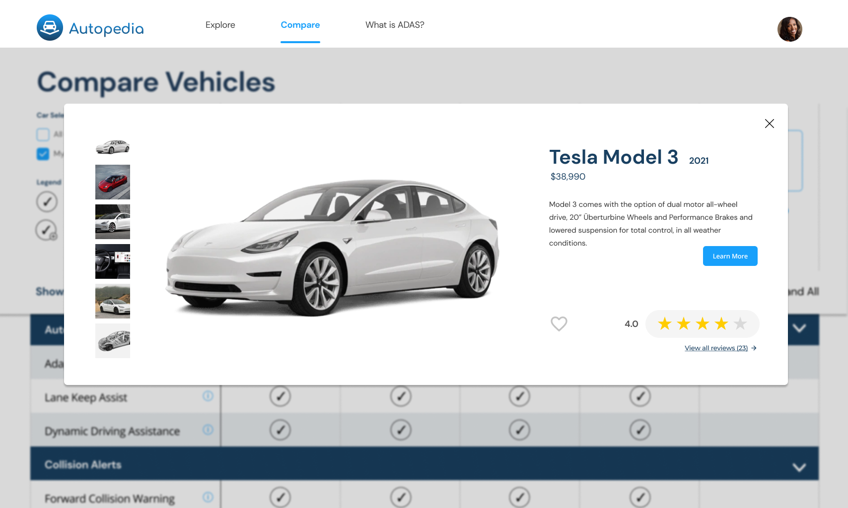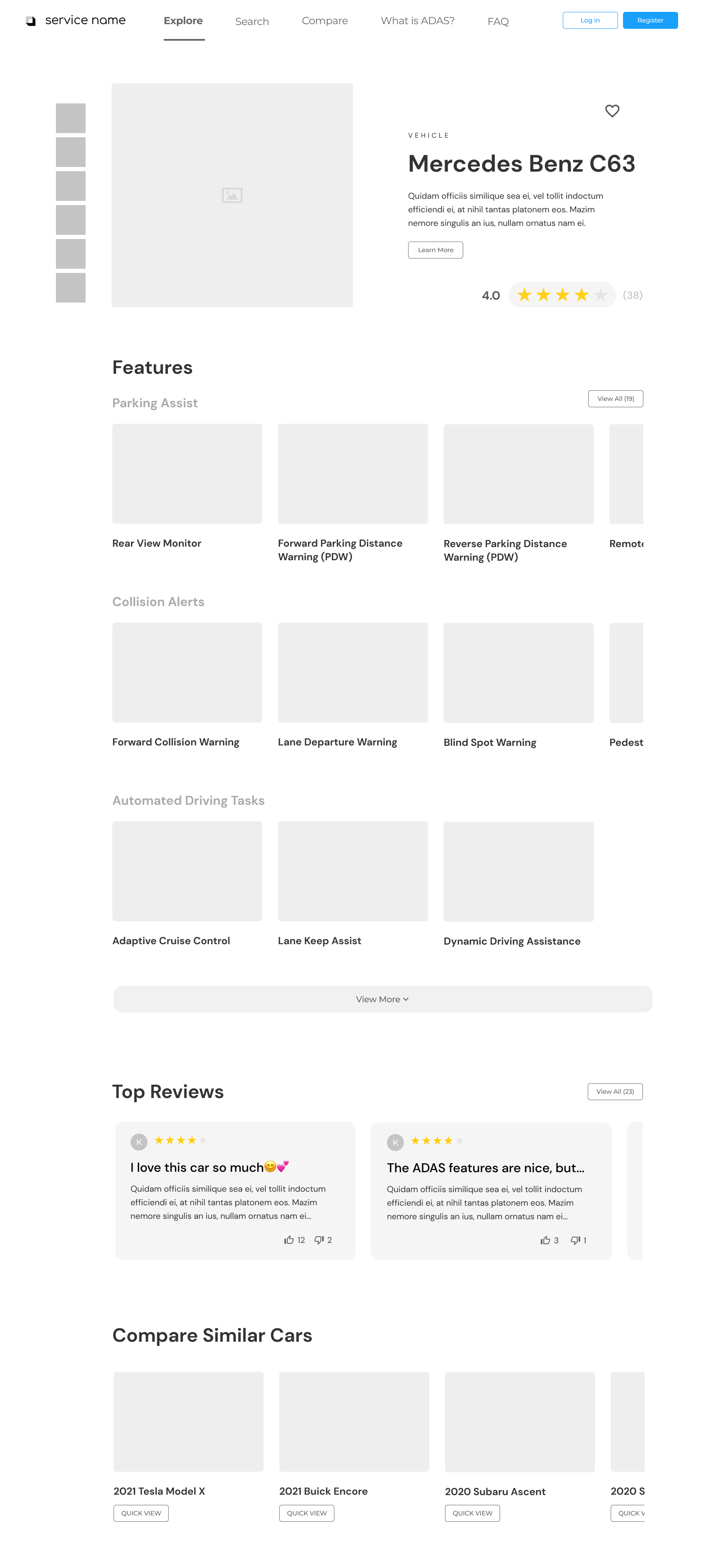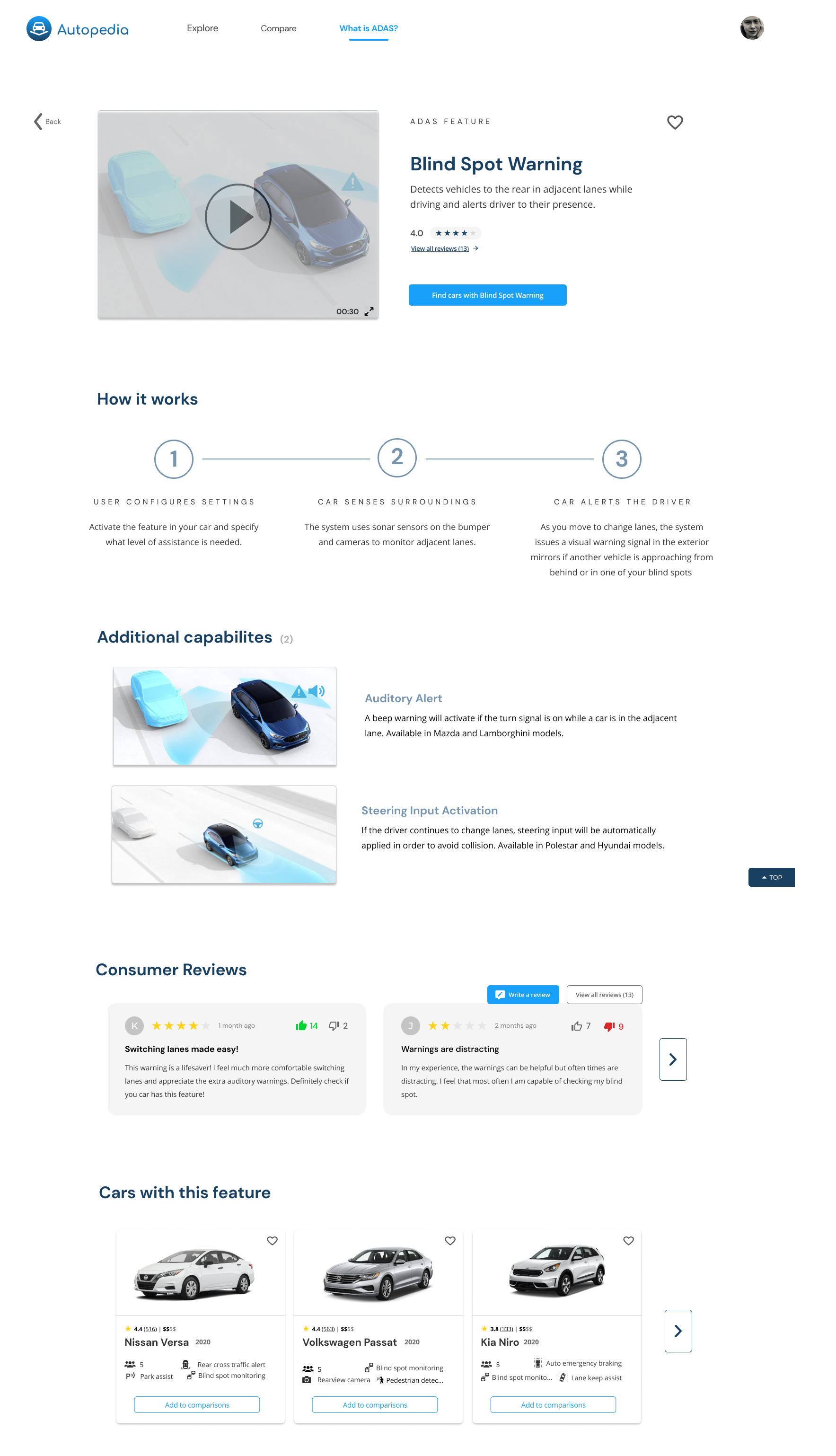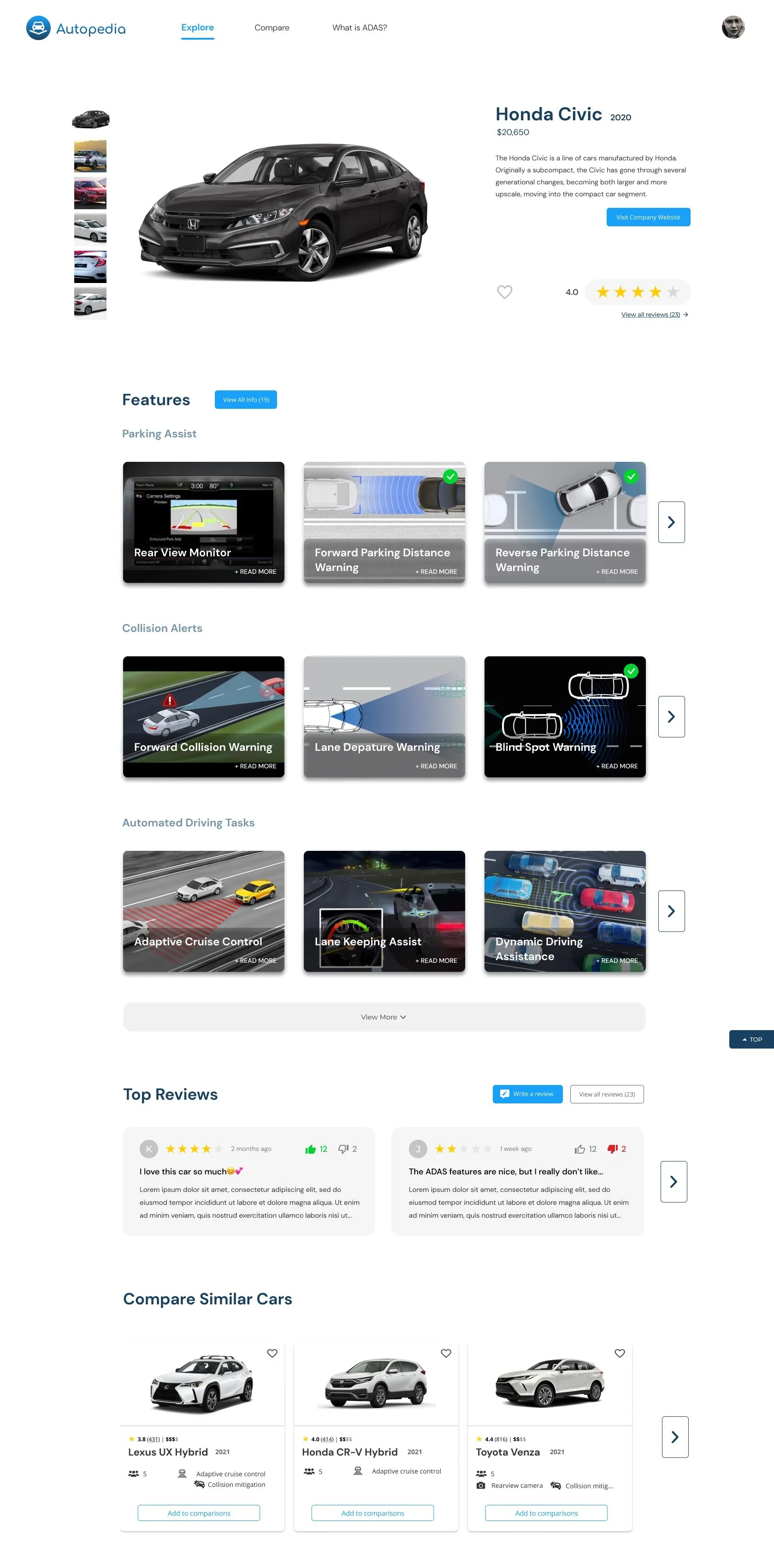 The car detail page, sampled on the right, highlights the car make, a description of the car, the price, reviews, an overview of ADAS—organized by category—found in the car, as well as a collection of similar cars with which the user can compare. From the car detail page, the user can click into any of the ADAS and be taken to its detail page to learn more about that specific feature.