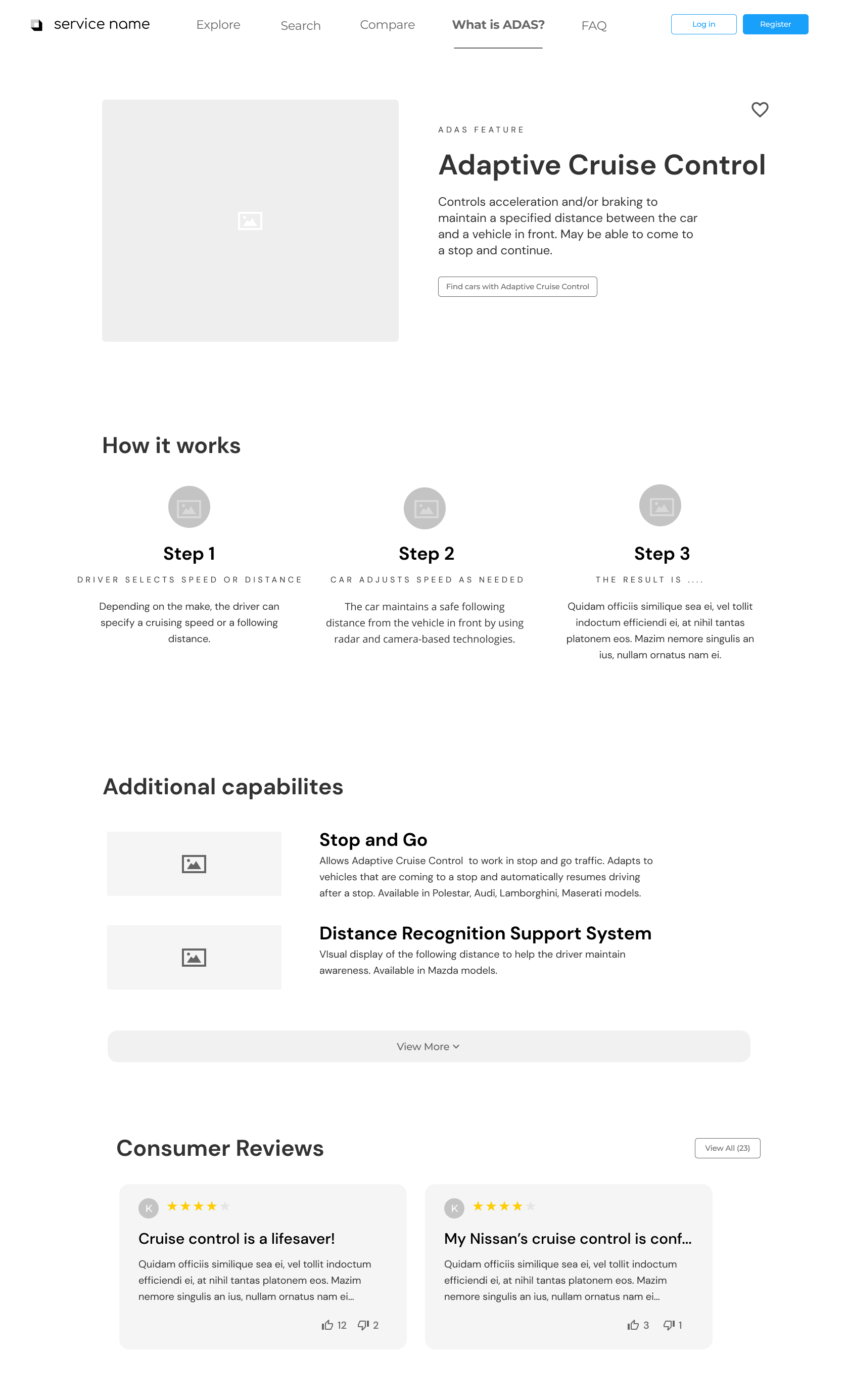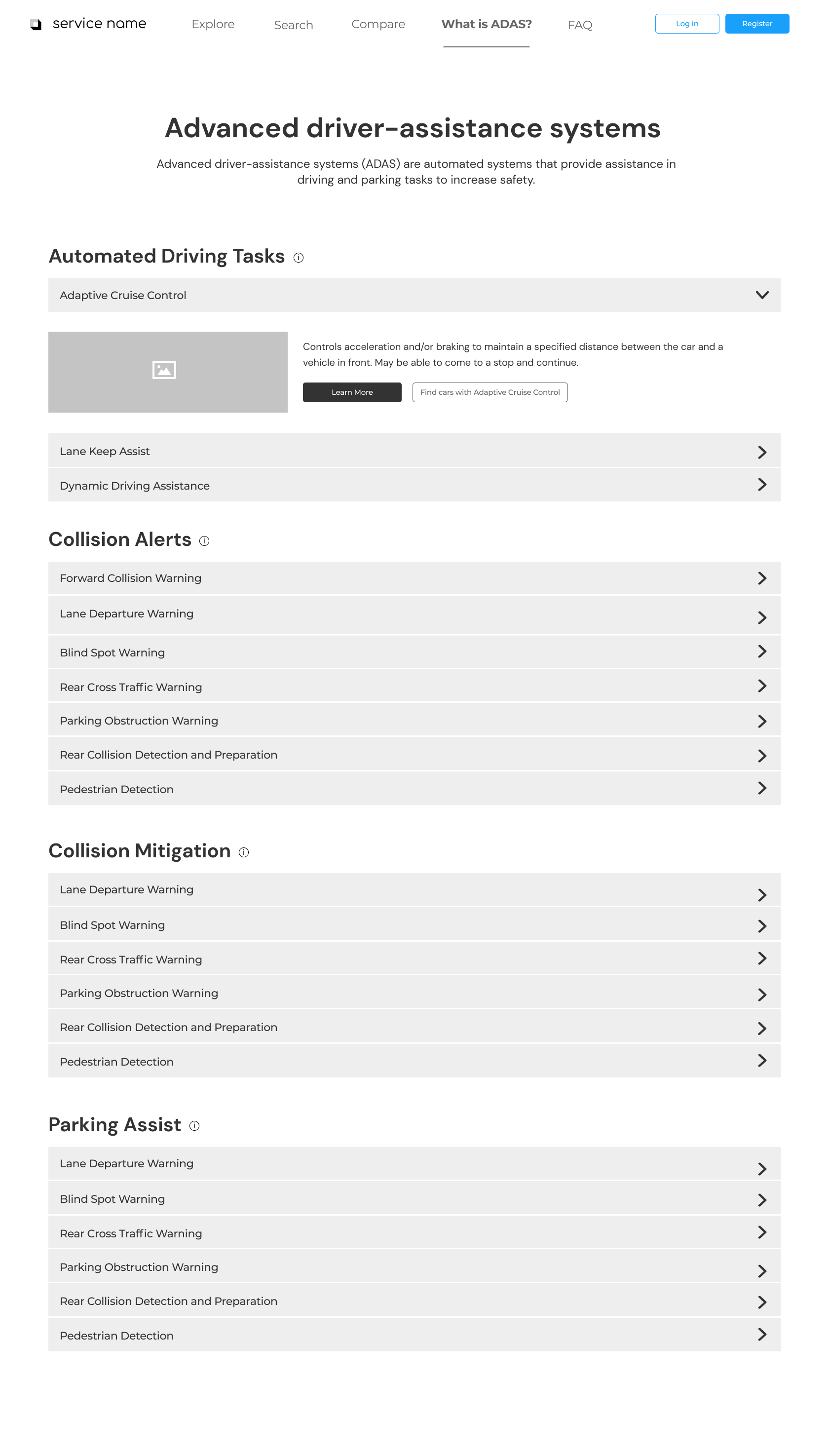 One of the most useful aspects of our website aimed to inform the user of specific features and how they worked, as well as which features were available in a certain car, so we developed two details pages that highlighted this information. The ADAS detail page, sampled on the left, highlights the universal name of the feature, how it works, reviews, as well as cars with that feature.
