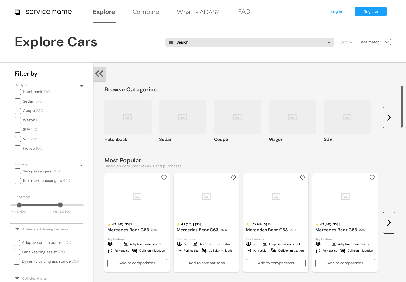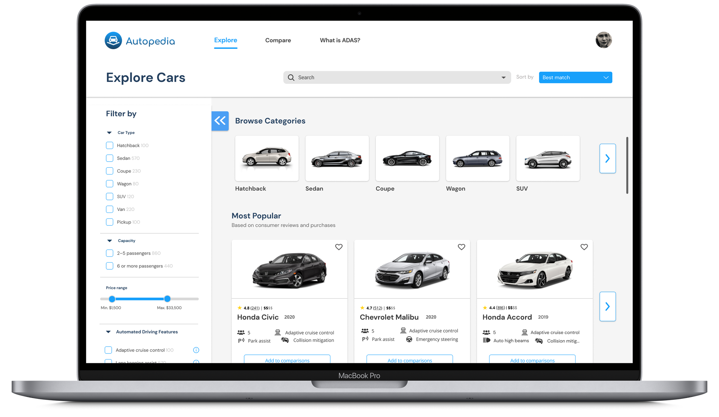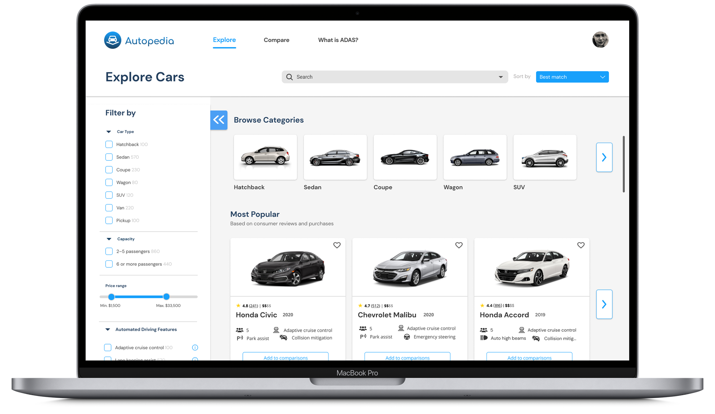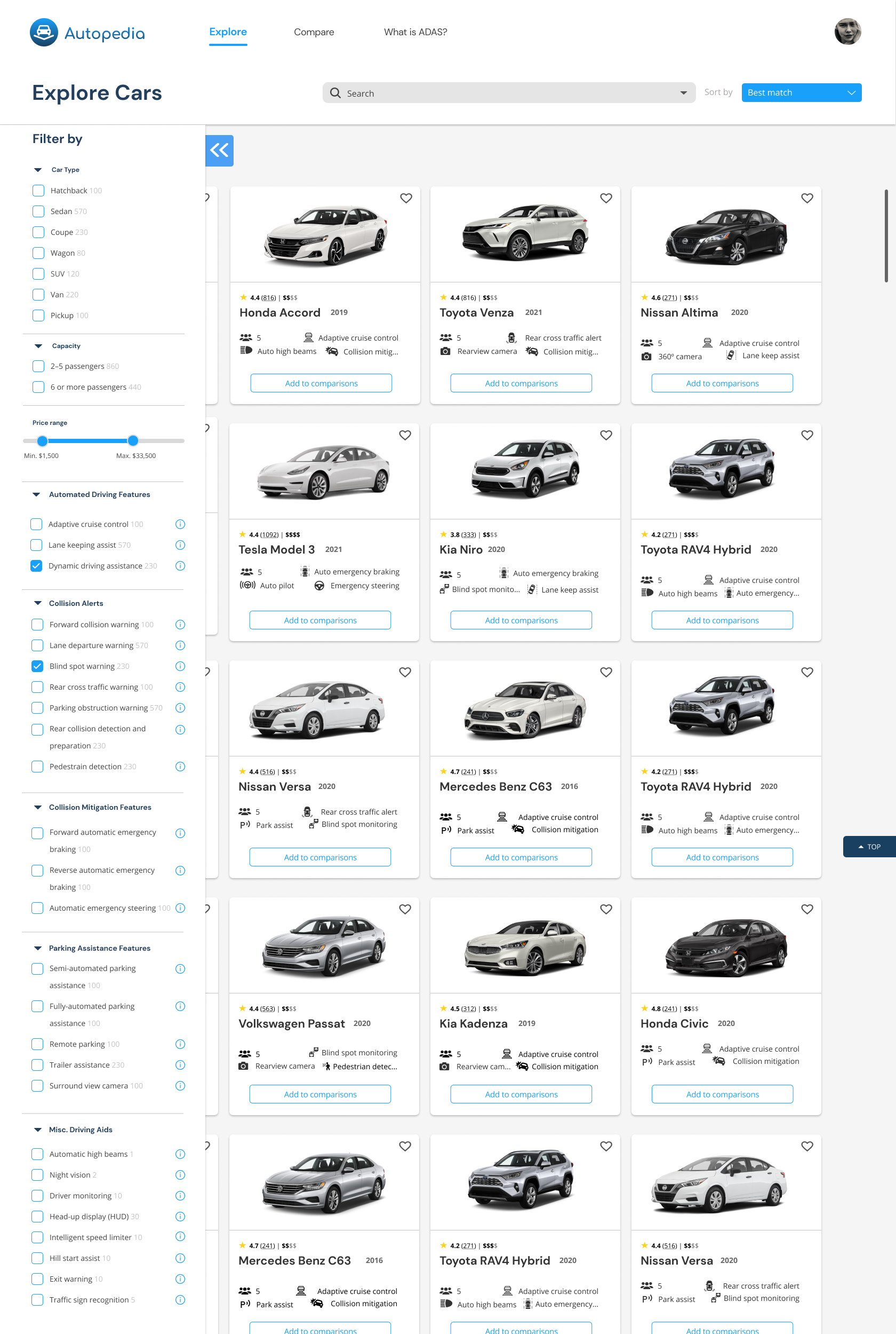Ability to filter for price, ADAS, rating, etc.