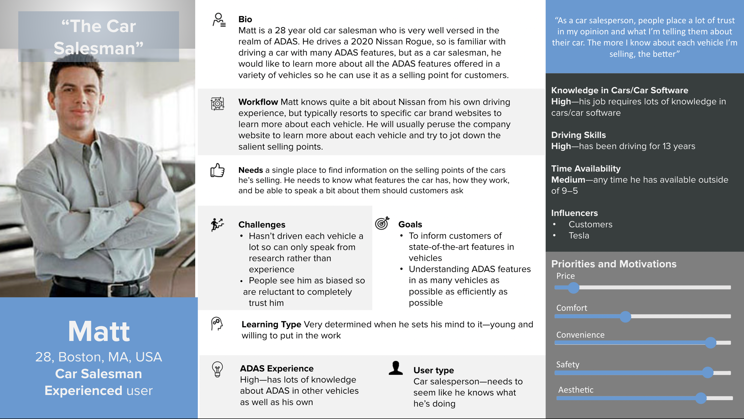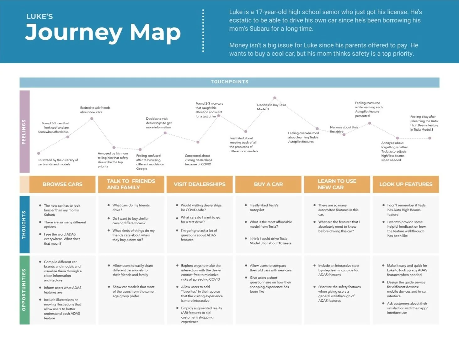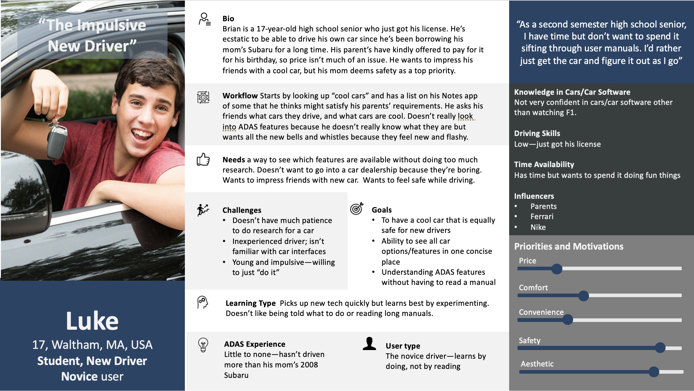 Our research team conducted a deep dive into current publications, studies, tests, and articles to consolidate the most common ADAS in cars—including specific examples of their use—and cross compared them with other vehicle brands and models. The resulting document became the backbone of our final interface, which aimed to collect, organize, and inform our user about this data.