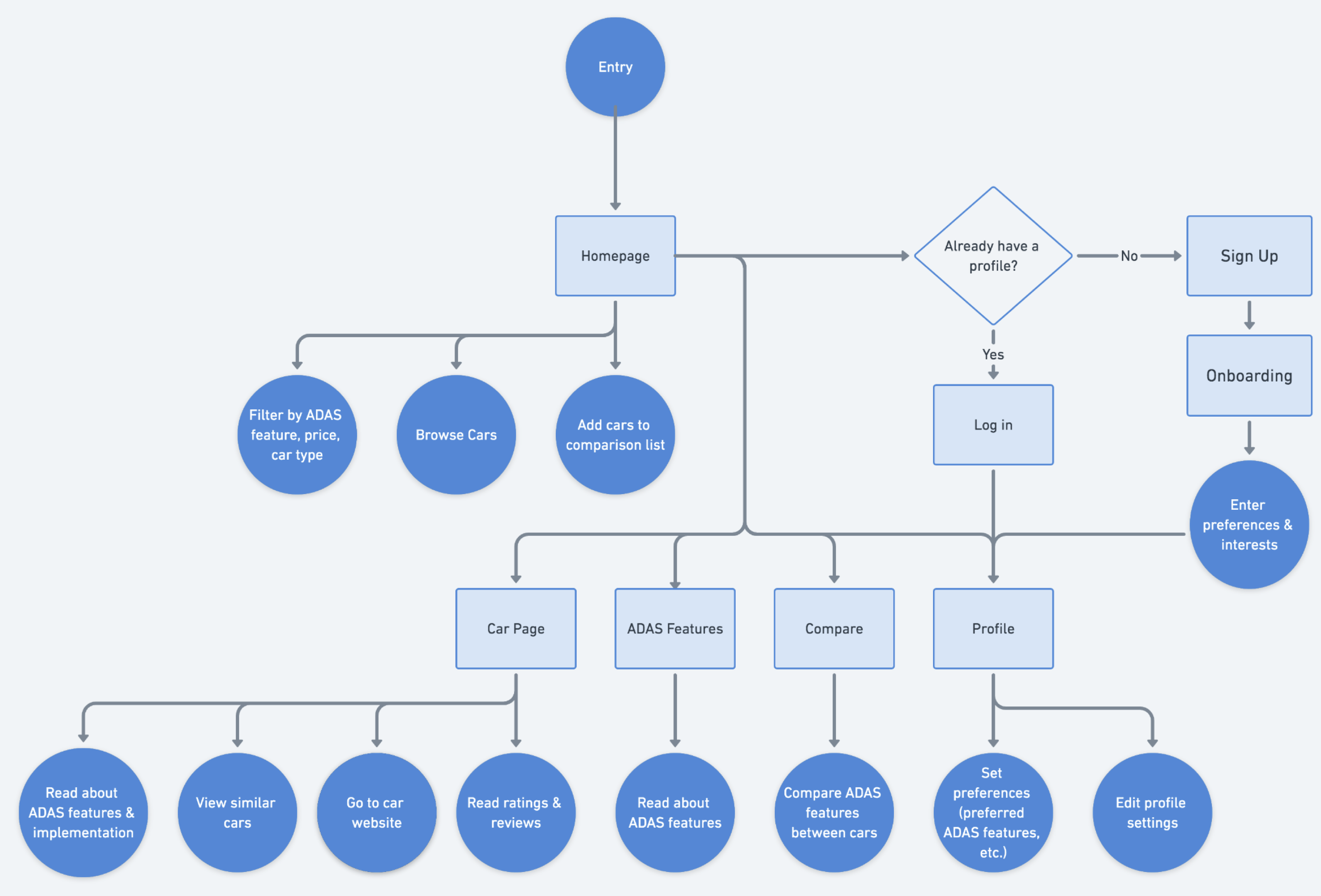 Once our research team had compiled an exhaustive report of existing ADAS, how they work, and cross-compared them with ADAS in other vehicles, the next step was to present this information in a user friendly way. We planned to design a desktop interface to serve as a centralized location for information about commercialized ADAS functionality. This would ultimately providing users a space to learn more about what ADAS is, browse cars and see what features each make and model has, and compare across different car brands to find their perfect car based on their preferences.